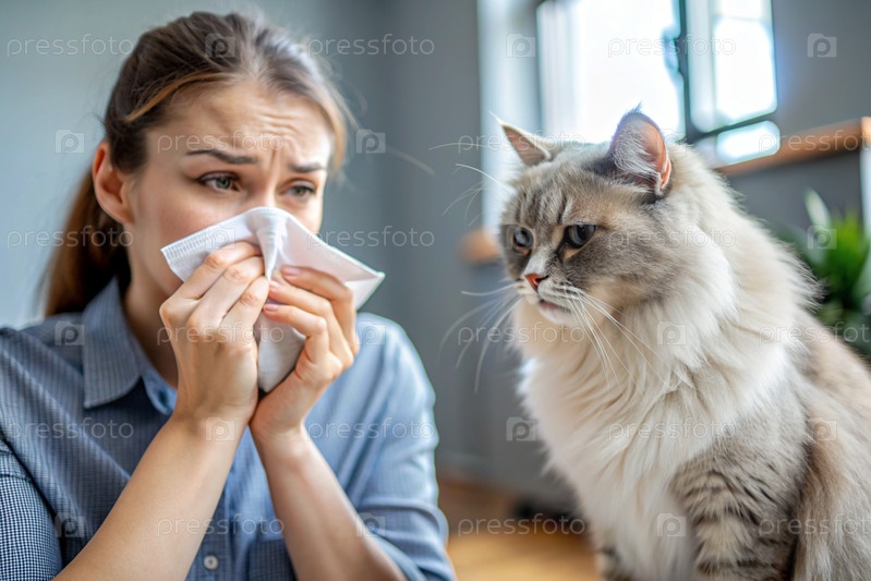 Женщина чихает в белую салфетку дома. Аллергия на волосы кошек и домашних животных. Рядом со мной кот