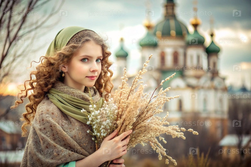Портрет девушки в русском народном шале с букетом дикой травы в руках на фоне православной церкви