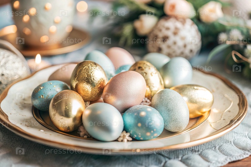 Пасхальный баннер. Настройка стола. Роскошная тарелка, пасхальные яйца с позолоченными красками. Концепция праздника Пасхи для кафе и ресторанов
