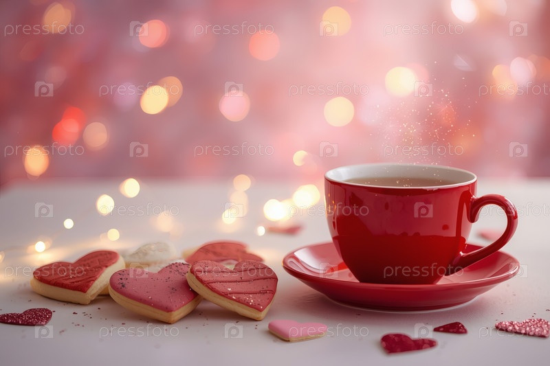 Домашнее имбирное печенье в форме сердца и чашка чая на столе. вкусный имбирный кекс в форме сердца на светло-розовом фоне. свежевыпеченный имбирный кекс на День святого Валентина
