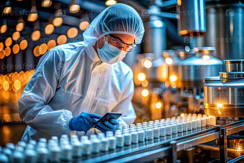 Производство лекарств: фармацевт тестирует медицинские флаконы на автоматическом трубопроводе фармацевтической производственной линии с использованием искусственного интеллекта