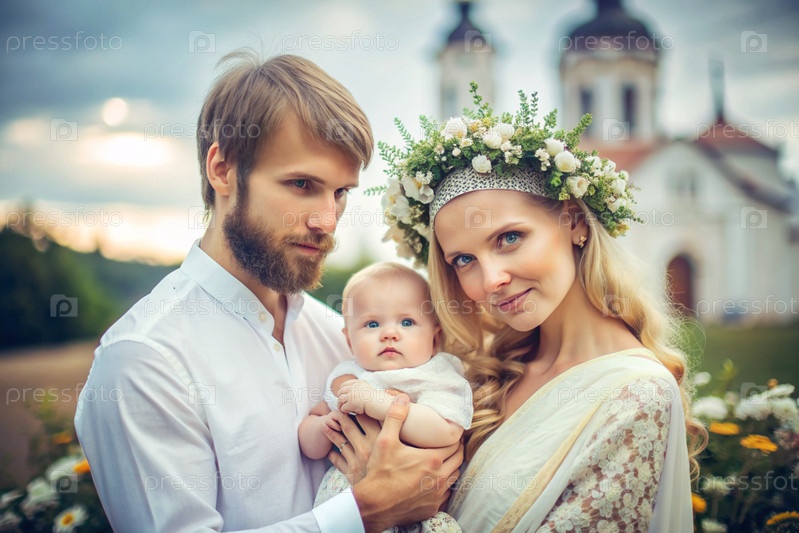 Всероссийский день семьи, любви, верности. мужчина и женщина с ромашками с ребенком в объятиях на фоне православной церкви. День святого Петра и Февронии
