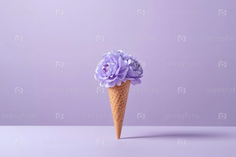 Минимальная студийная фотография. Вафельный конус. Наполненный тонкими пастельными цветами, напоминающими пионы или розы, с многослойными лепестками в мягкой сирены и голубыми оттенками на фиолетовом фоне