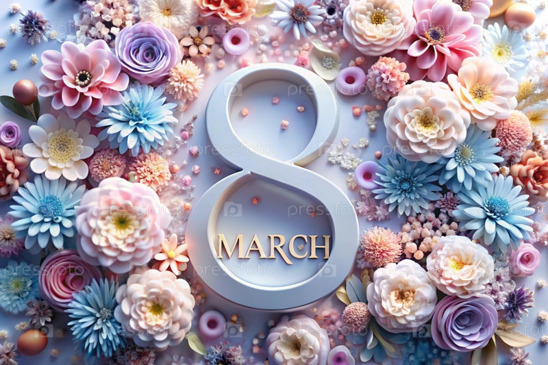 Международный женский день. Баннер, флаер. Праздничный, нежный цветочный фон в голубых и розовых тонах с номером 8