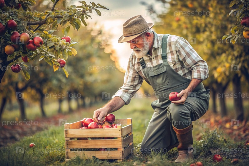 Сельскохозяйственная промышленность. Деревянный ящик с яблоками в руках фермера-мужчины. Садовник собирает богатый урожай. Ближе, солнечный свет. Осенний плодовый сбор
