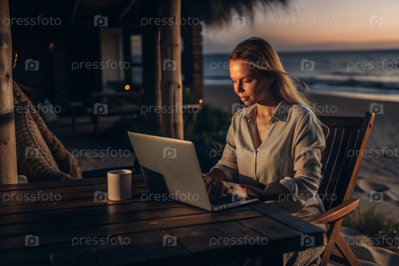 Молодая женщина-фрилансер работает на ноутбуке, отдыхая у моря или делая покупки в Интернете