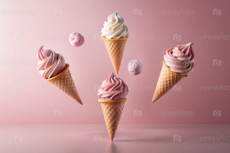 сладкий, холодный десерт. сливочное ванильное мороженое с различными вкусами в конусах пластинок. баннер, реклама. Всемирный день мороженого. сладкий десерт