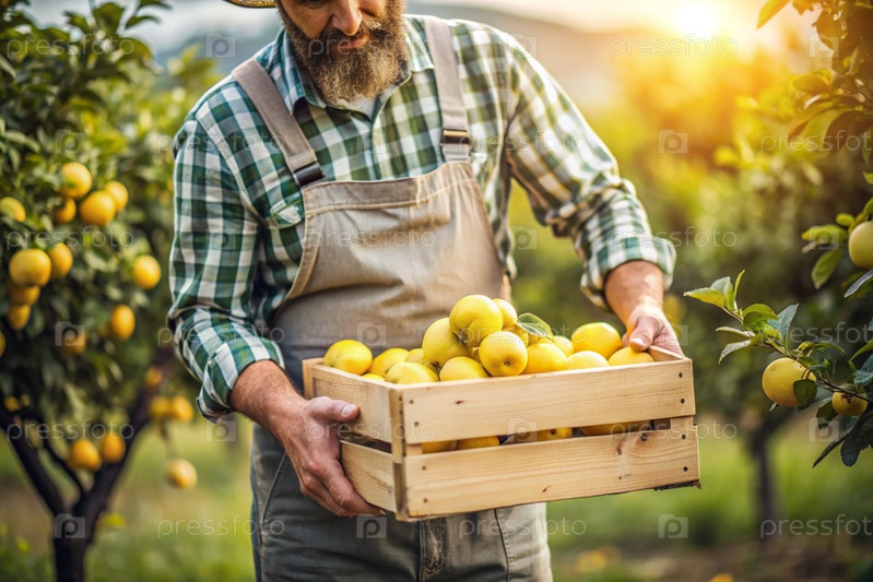 Сельскохозяйственная промышленность. Деревянный ящик с лимонами в руках фермера. Садовник собирает богатый урожай. Ближе, солнечный свет. Осенний плодовый сбор
