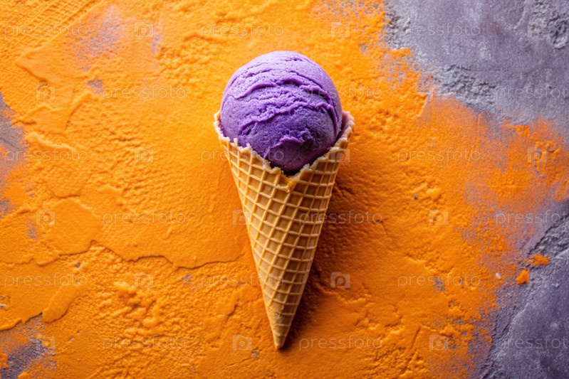 Сладкий десерт. Стильная современная концепция. Фиолетовый конус мороженого на ярко-оранжевом фоне. Всемирный день мороженого