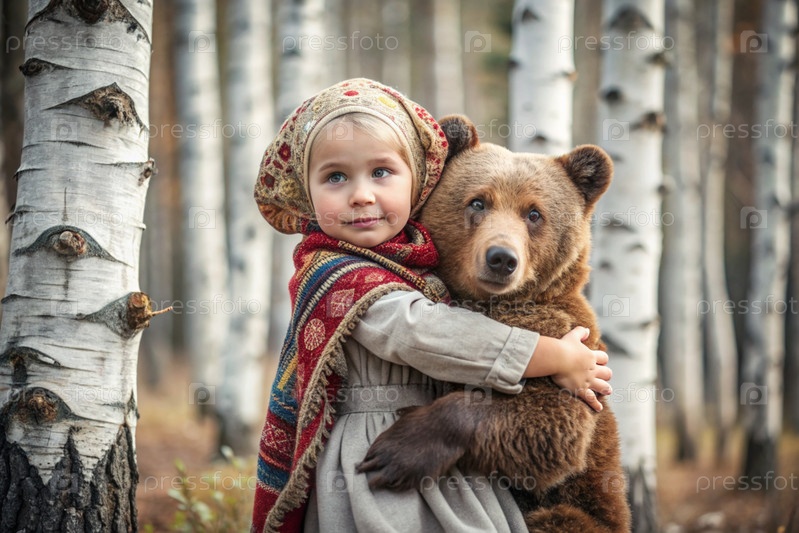 Красивая маленькая девочка в русской народной одежде и с платками на голове в березовой роще с живым медведем Русский фольклор, славянская мифология