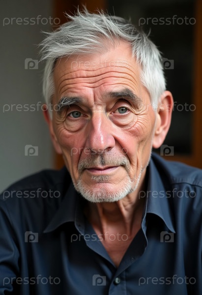 Пожилой человек сидит в спокойном созерцании, его серебристые волосы и выразительное лицо отражают жизненные переживания