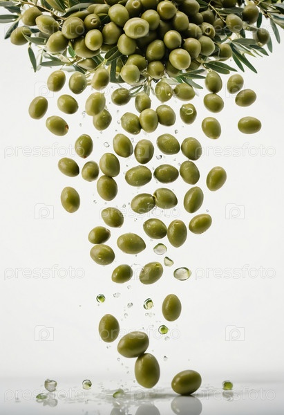 Блестящие зеленые оливки грациозно падают с ветви, брызгая водой.Это яркое изображение отражает сущность свежести и щедрости природы