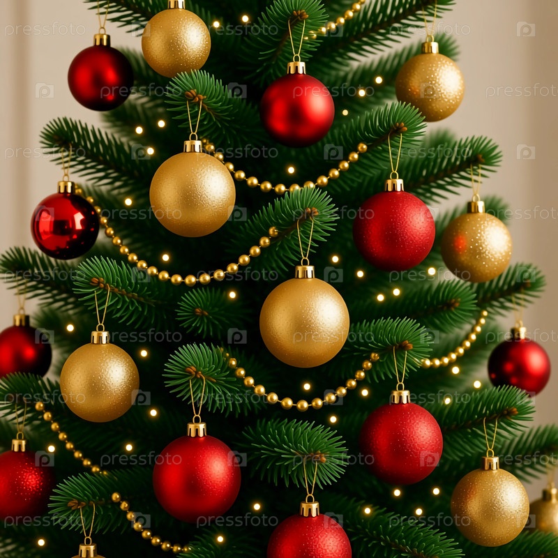 Рождественская елка украшается красными и золотыми шарами, светящимися огнями и нитками бусин