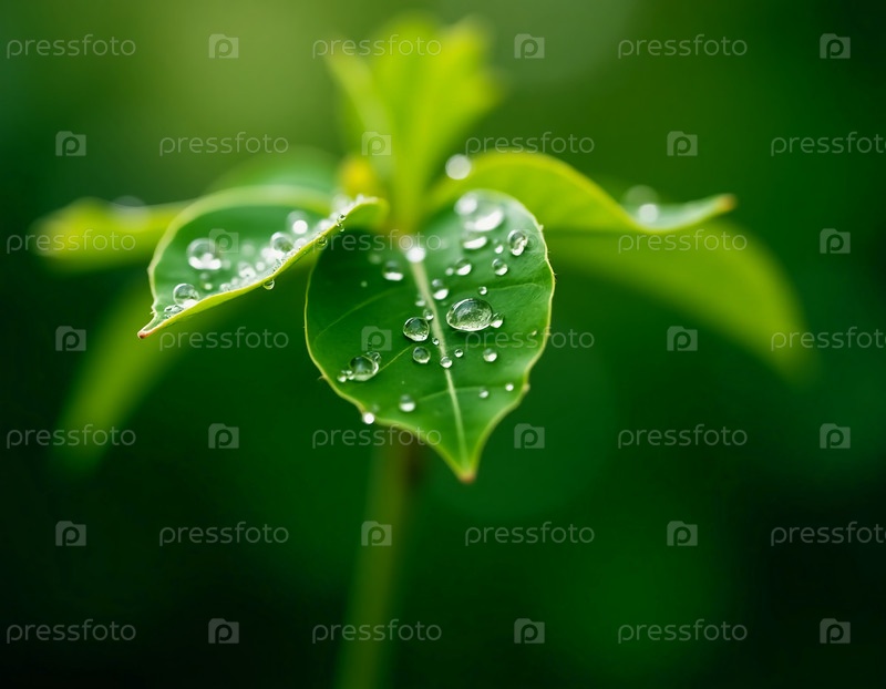 Свежие зеленые листья сверкают утренней росой, когда проходит солнечный свет, создавая спокойную атмосферу в пышном саду