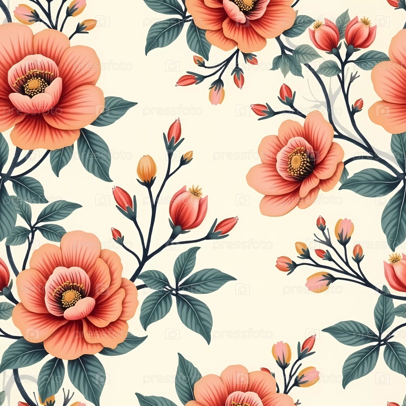 Деликатные пастельные цветы каскадируют на мягком фоне, ткая яркие цветки и нежные бутоны, которые вызывают спокойную атмосферу