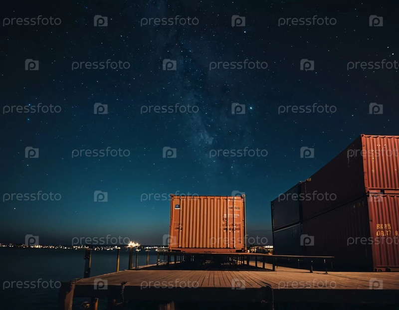 Под небесным одеялом звезд судоходные контейнеры смело стоят в доке, бросая тень на тихие воды, а далекие портовые огни мерцают ночью