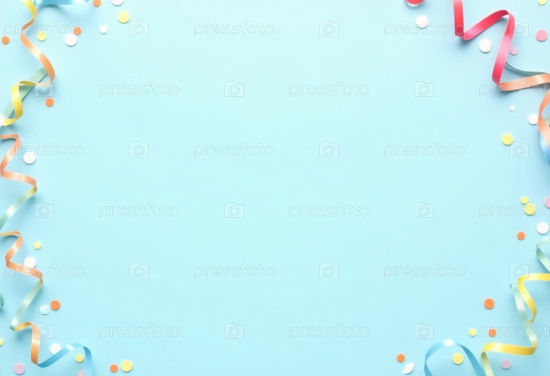 Яркий дисплей красочных лент и конфетти создает радостную атмосферу на мягком синем фоне, идеально подходит для любых праздников или вечеринок