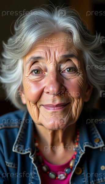 Веселая пожилая женщина с серебристыми волосами излучает тепло и мудрость, ее нежная улыбка освещает уютные комнаты