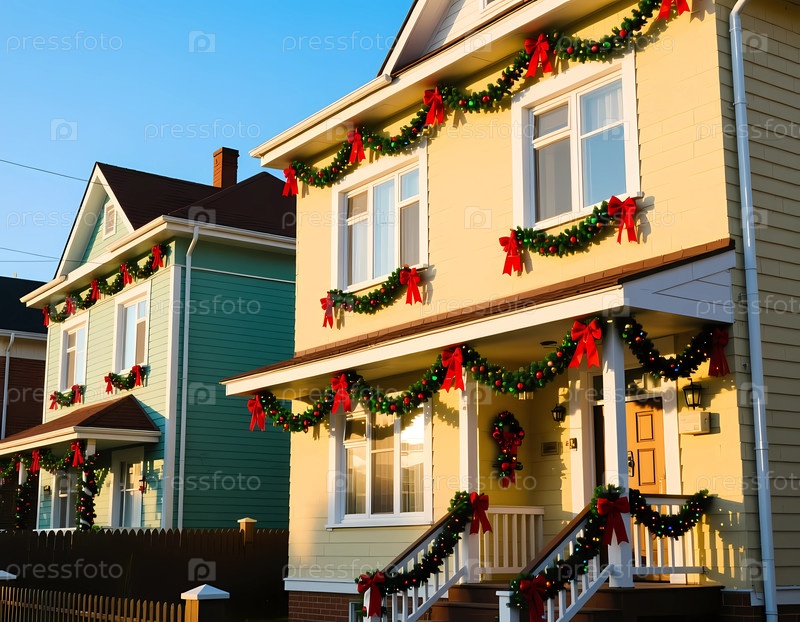 Два дома демонстрируют рождественские гирлянды с красными луками и зеленью на своих фасадах.Эта сцена отражает праздничный дух сезона каникул в соседней генеративной AI