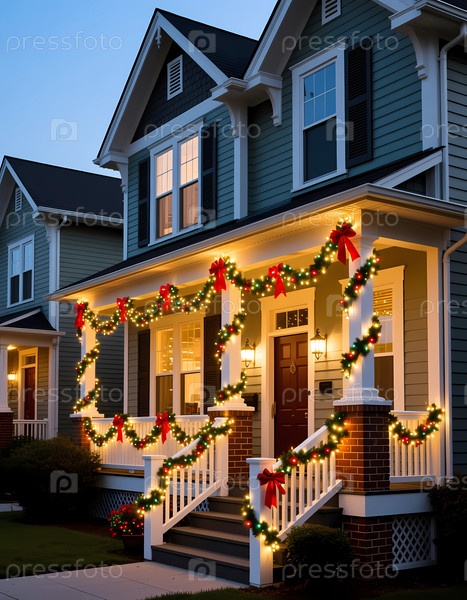 Дом освещен рождественскими украшениями, включая гирлянды и луки.Входные ступени приглашены, так как вечерний свет создает праздничную атмосферу Generative AI