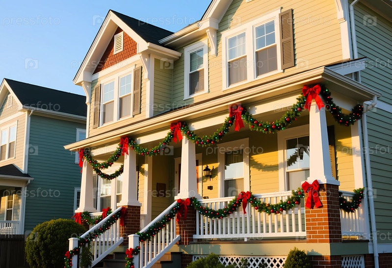 Дом с желтой оболочкой украшен зеленой и красной гирляндой на Рождество. луки и орнаменты улучшают праздничную атмосферу во время праздничного сезона