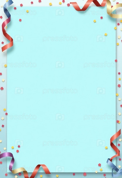 Ярко-синий фон, украшенный праздничными лентами и красочными конфетти, создает веселую атмосферу, идеально подходящую для торжеств, вечеринок или специальных мероприятий