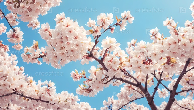 Под ярко-синим небом ветви, загруженные розовыми цветами вишневых цветов, простираются наружу, сигнализируя о приходе весны и радости красоты и обновления природы