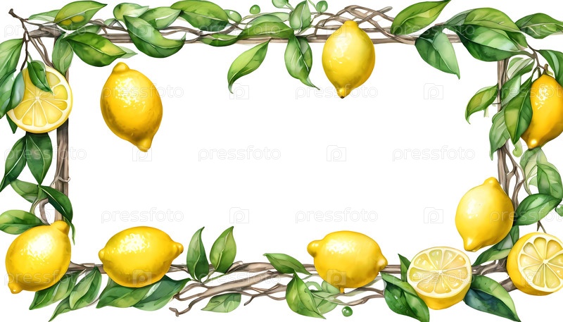 Создайте освежающее лимонное приглашение с ярким акварельным искусством, демонстрирующим генеративные цитрусовые АИ и пышные зеленые листья