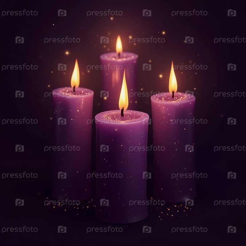 Несколько фиолетовых свечей с пылающим пламенем расположены вместе в темной среде, обеспечивая спокойную атмосферу, идеально подходящую для расслабления или созерцания