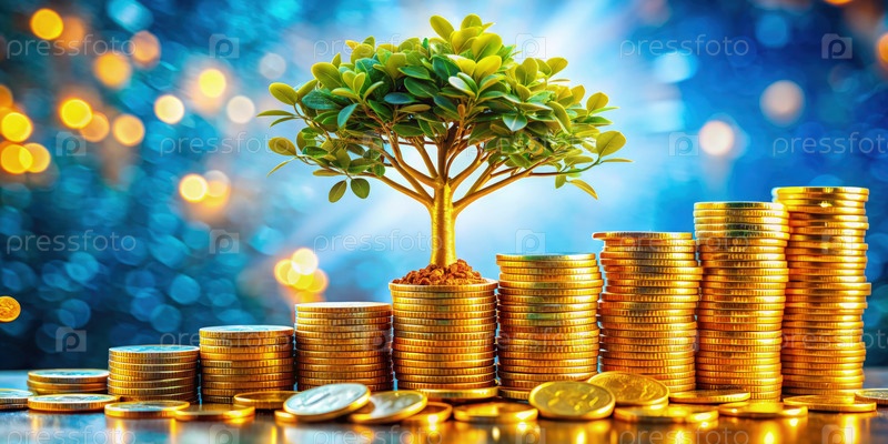 Растущий финансовый успех представлен нагромождениями золотых монет и дерева