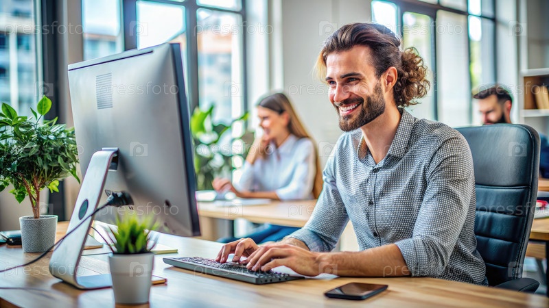 Веб-дизайнер улыбается, работая на компьютере в современном офисе
