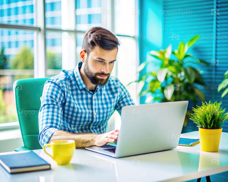 Бородатый веб-дизайнер, работающий на ноутбуке в современном офисе