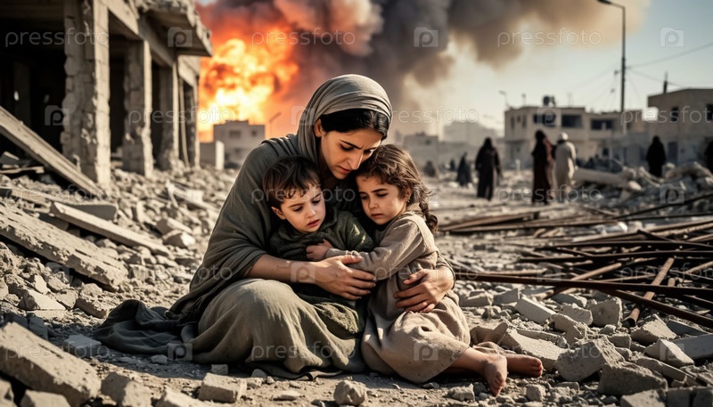 Арабская женщина с детьми в эпицентре ядерного взрыва