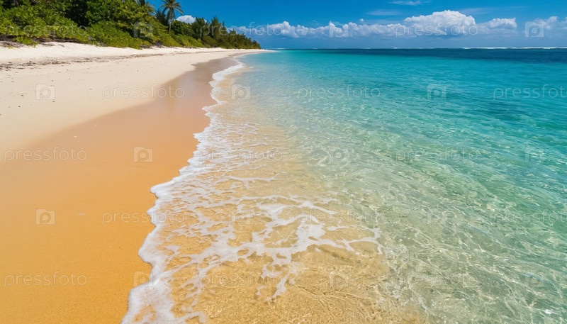 Красивый пляж - прозрачные мягкие голубые волны, бегущие на желтый песок