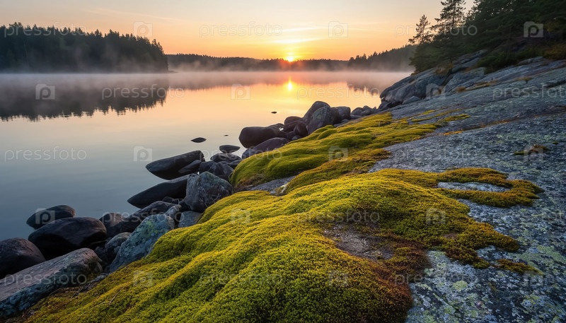 Большое озеро с каменистым берегом, валуны, покрытые мхом, туман, утро