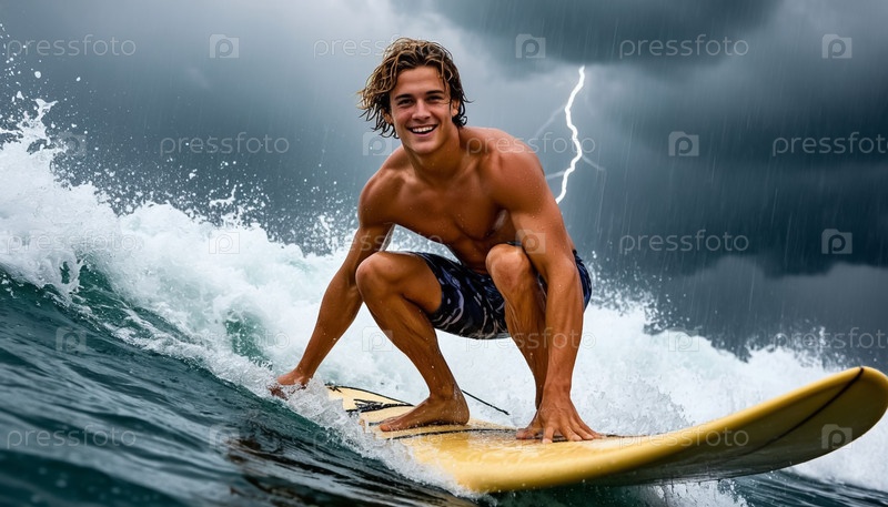 Молодой человек во время грозы и грозы с молнией в море на доске для серфинга