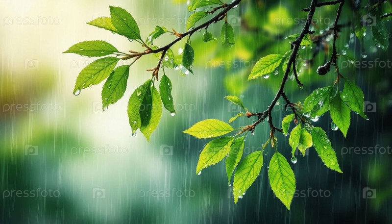 Ветвь с зелеными листьями, дождь