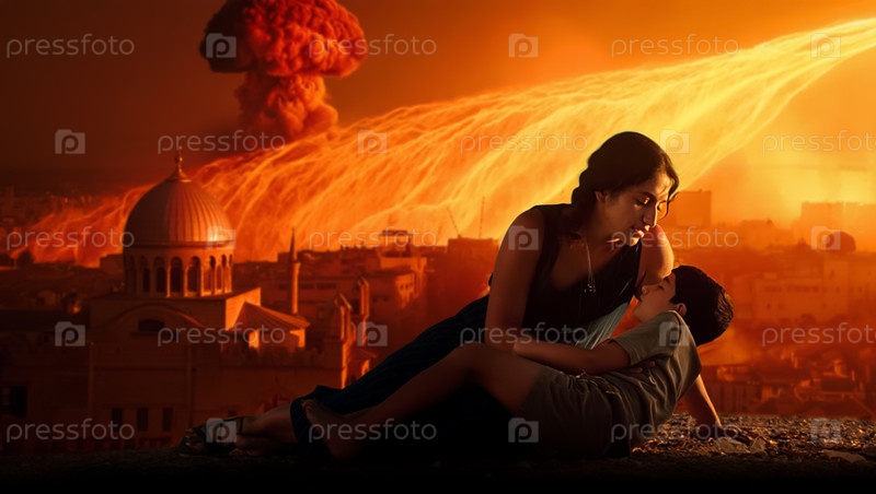 Мать с ребенком на фоне ядерного взрыва над ближневосточным городом