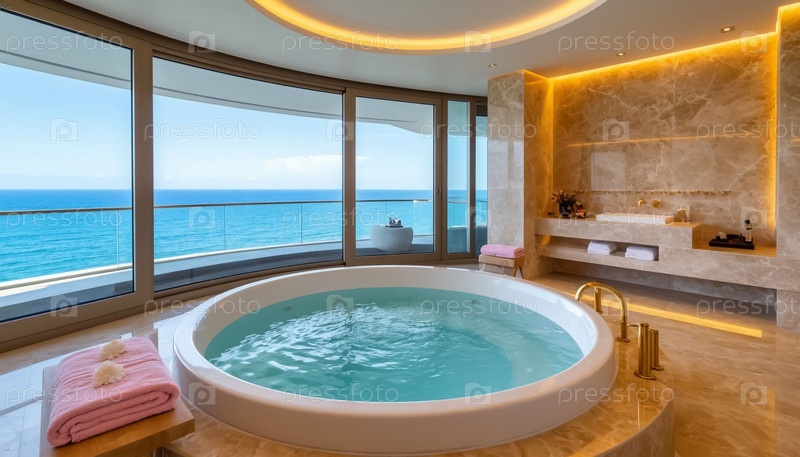 Интерьер роскошной ванной комнаты с панорамным окном и круглым джакузи, видом на море, отель