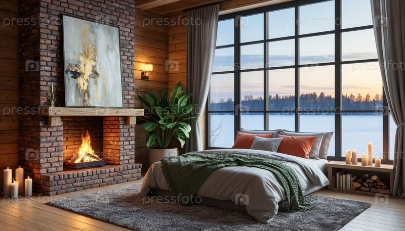 Интерьер уютной спальни для романтических выходных Камин, свечи, панорамные окна, коттедж, отель