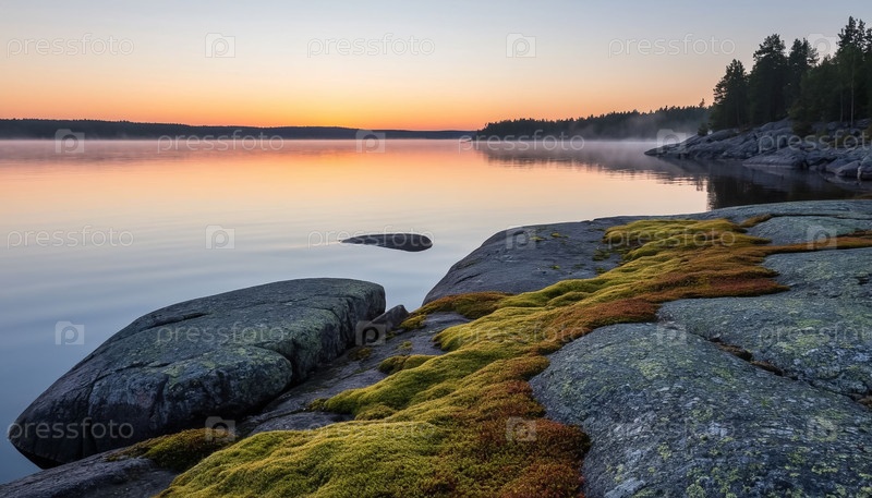 Большое озеро с каменистым берегом, валуны, покрытые мхом, туман, утро