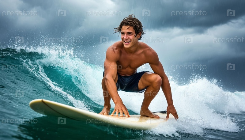 Молодой человек во время грозы и грозы с молнией в море на доске для серфинга