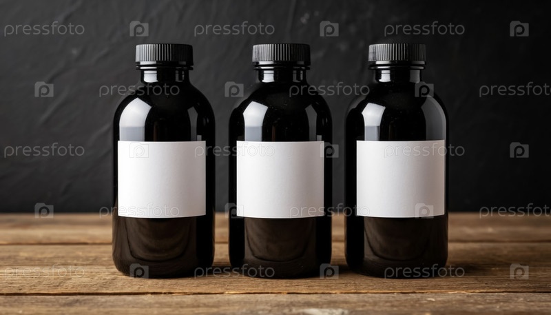 Три темных пластиковых бутылки с пустыми этикетками