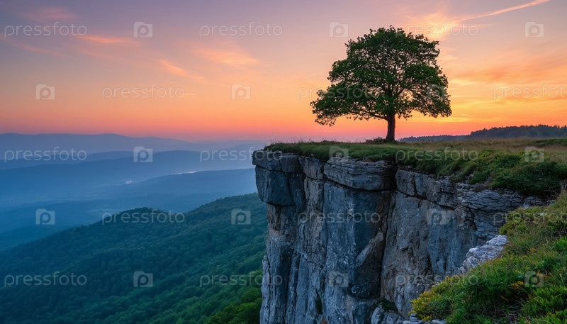 Одинокое дерево на крутой скале среди туманного утра