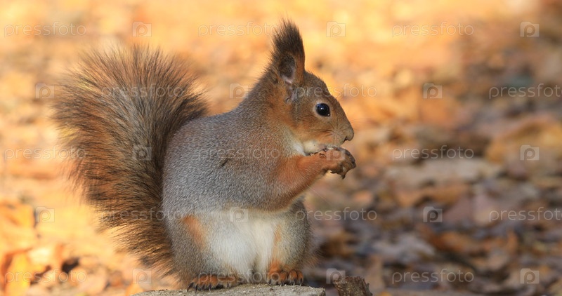 Белка с пушистым хвостом жевает орехи