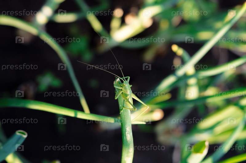 Зеленый саранча (Tettigonia viridissima) сидит на перье лука