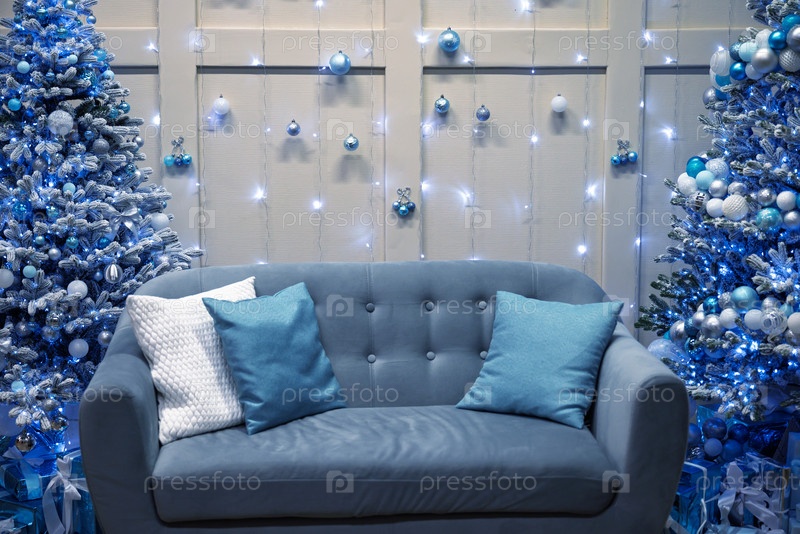 Уютный синий диван с декоративными подушками стоит перед двумя голубыми рождественскими елками, украшенными орнаментами и огнями