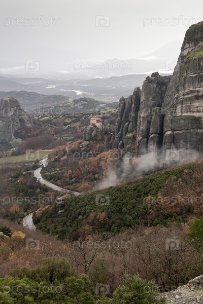 Православные монастыри Метеоры (Греция) на скалах, окутанных туманом