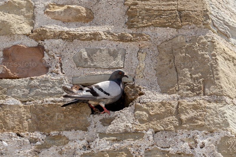 Близкий план разноцветного голубя, сидящего на старой стене