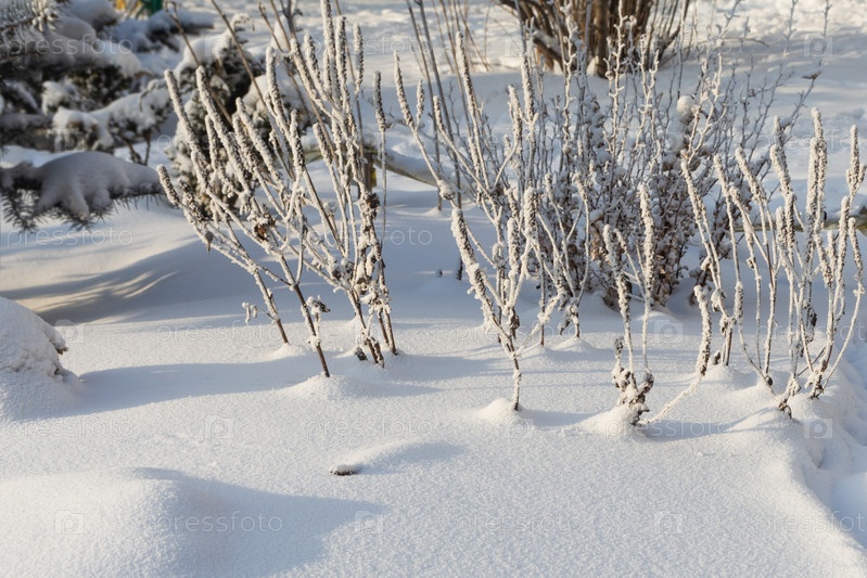 Покрытые снегом кустарники. Снежные, сухие стебли травы. Последствия снегопада
